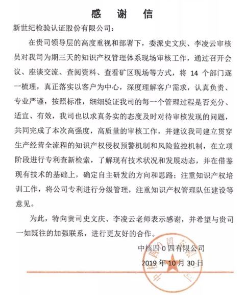 四O四對(duì)認(rèn)證審核工作高度重視、積極配合,順利通過(guò)知識(shí)產(chǎn)權(quán)管理體系的認(rèn)證審核,證書認(rèn)證范圍是:與核燃料的加工,核設(shè)施退役相關(guān)的知識(shí)產(chǎn)權(quán)管理。在征得公司同意之后,BCC將四O四作為優(yōu)秀貫標(biāo)案例向國(guó)家知識(shí)產(chǎn)權(quán)局進(jìn)行了推薦。