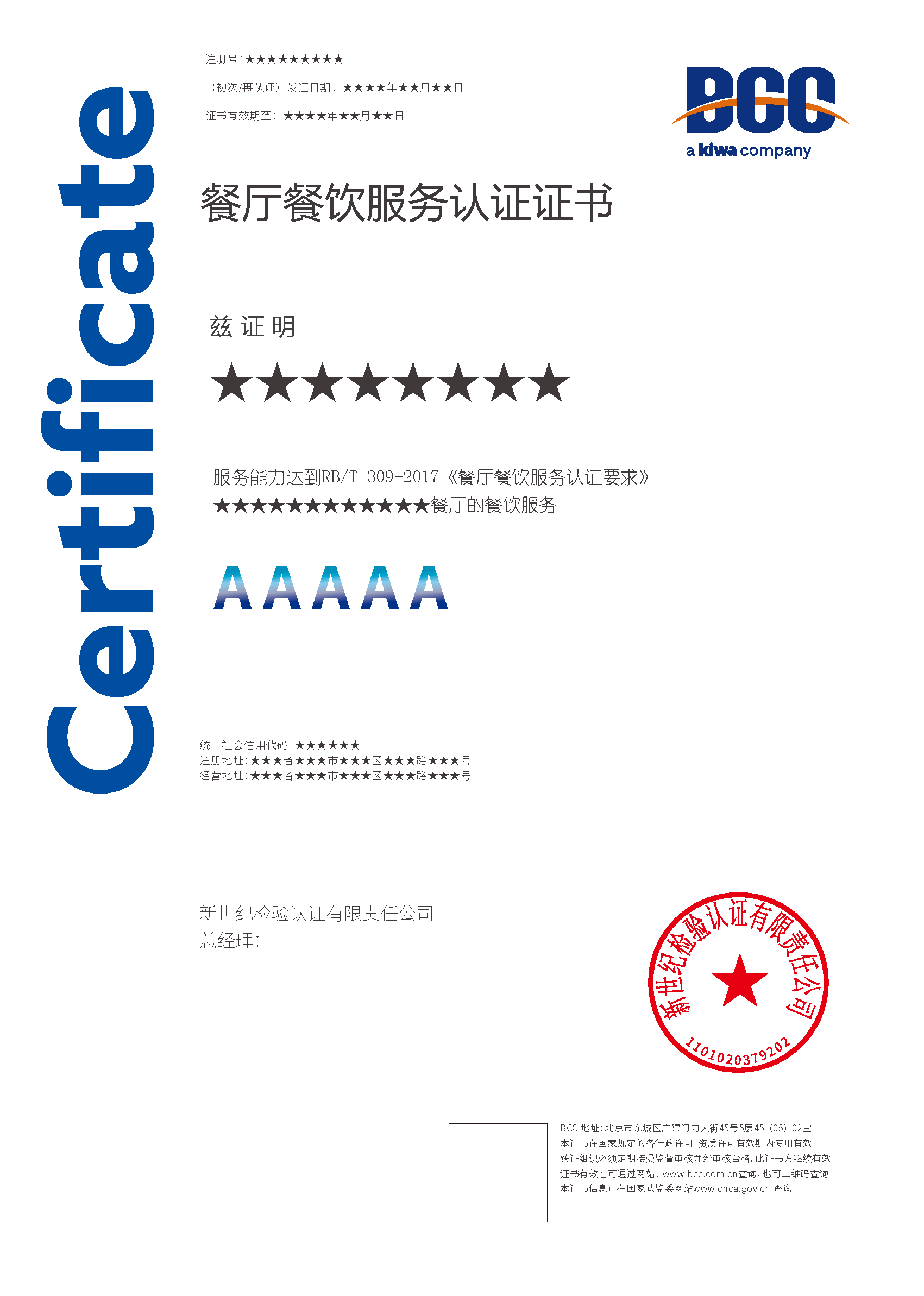 餐廳餐飲服務(wù)認(rèn)證的證書有效期為三年,每年BCC會對獲證組織進(jìn)行必要的監(jiān)督審查,證書到期前還要實施再認(rèn)證審查。