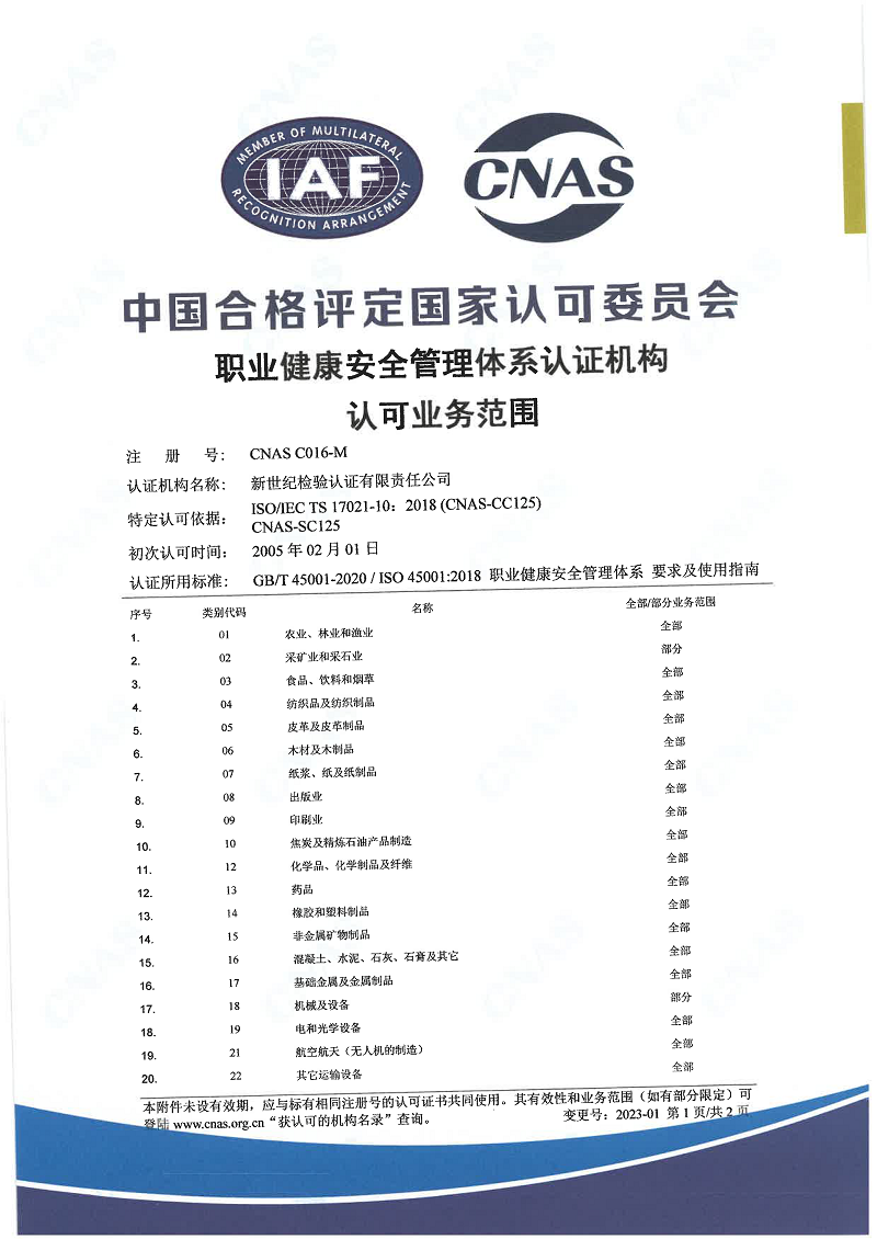 | 職業(yè)健康安全管理體系認(rèn)證機(jī)構(gòu)認(rèn)可證書(一) |