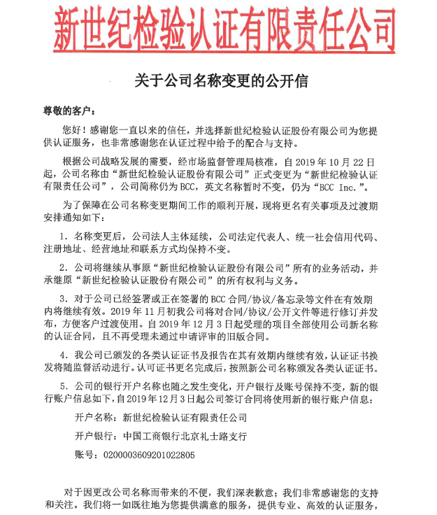 根據(jù)公司戰(zhàn)略發(fā)展的需要,經(jīng)市場監(jiān)督管理局核準,自2019年10月22日起,公司名稱由“新世紀檢驗認證股份有限公司”正式變更為“新世紀檢驗認證有限責任公司”,公司簡稱仍為BCC,英文名稱暫時不變,仍為“BCC Inc.”。