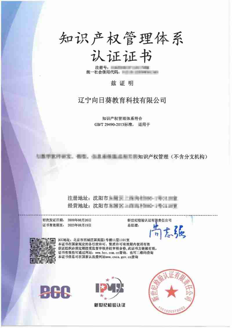 近日,向日葵教育科技順利通過知識產(chǎn)權(quán)管理體系認(rèn)證審核,喜獲由新世紀(jì)檢驗(yàn)認(rèn)證有限責(zé)任公司(簡稱BCC)頒發(fā)的知識產(chǎn)權(quán)管理體系認(rèn)證證書。