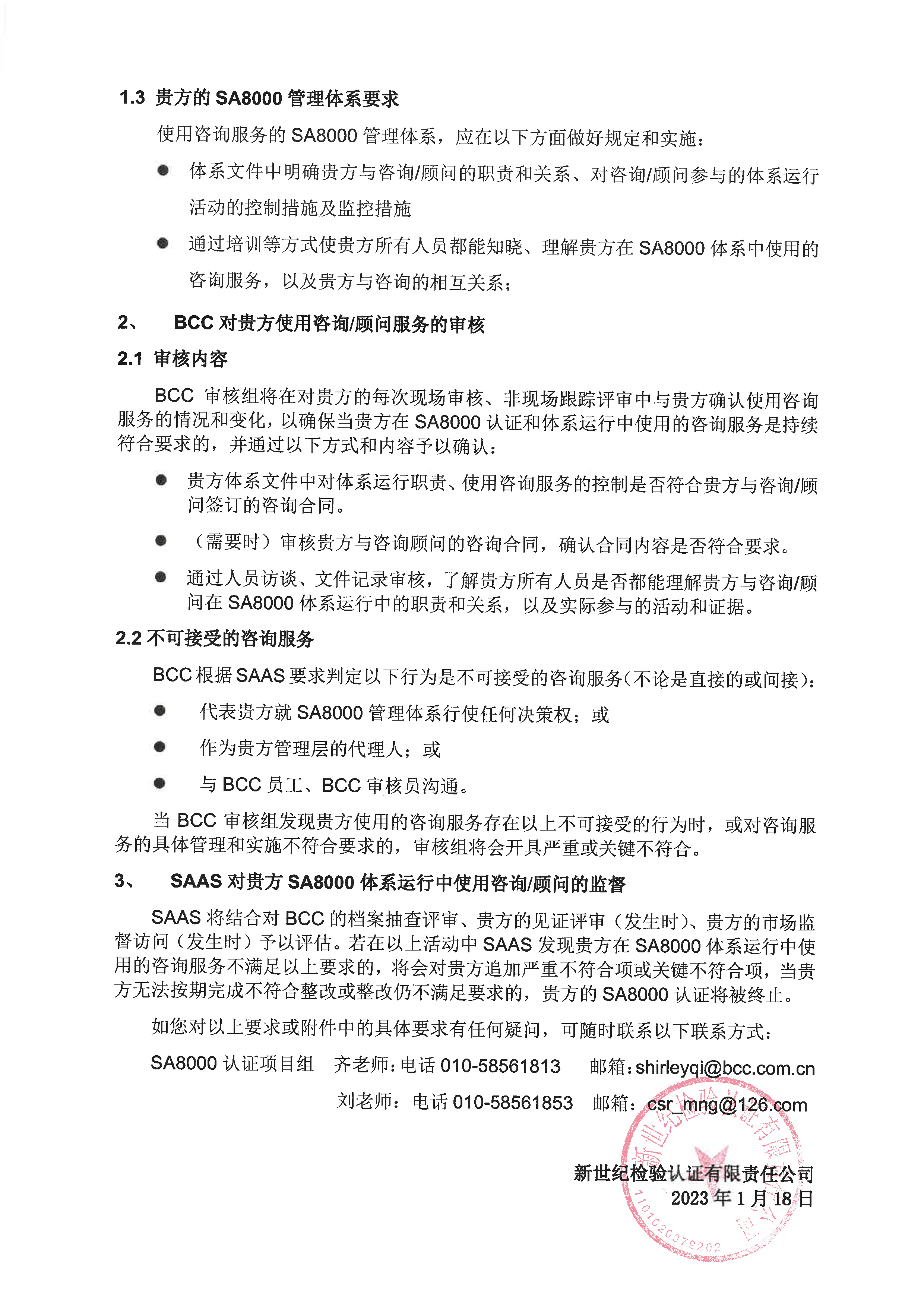 該文件中對認證機構、SA8000已獲證客戶、新申請SA8000認證的組織都提出了更具體的要求,這些要求將在2023年2月1日實施。以下就該文件中與貴方有關的內容予以說明告知,BCC審核組也將自2023年2月1日開始在審核中向貴方了解、收集、確認以下信息,請貴方提前知悉: